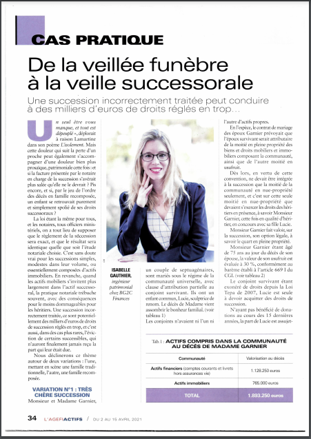 Isabelle GAUTHIER, ingénieur patrimonial chez BG2C FINANCES vient de publier un article dans la revue de référence "L'Agefi Actifs" d'avril 2021. Elle nous éclaire sur la succession.